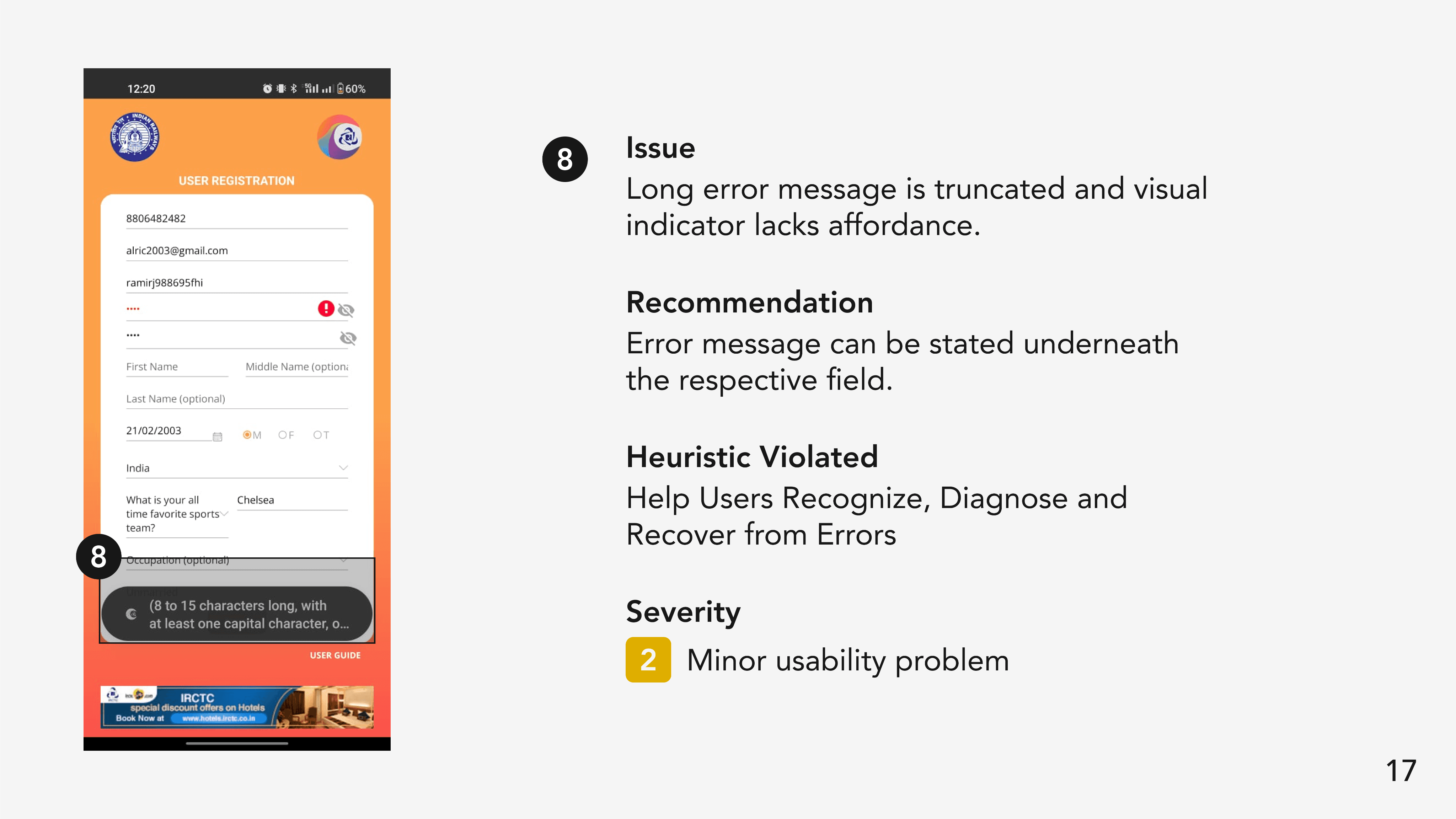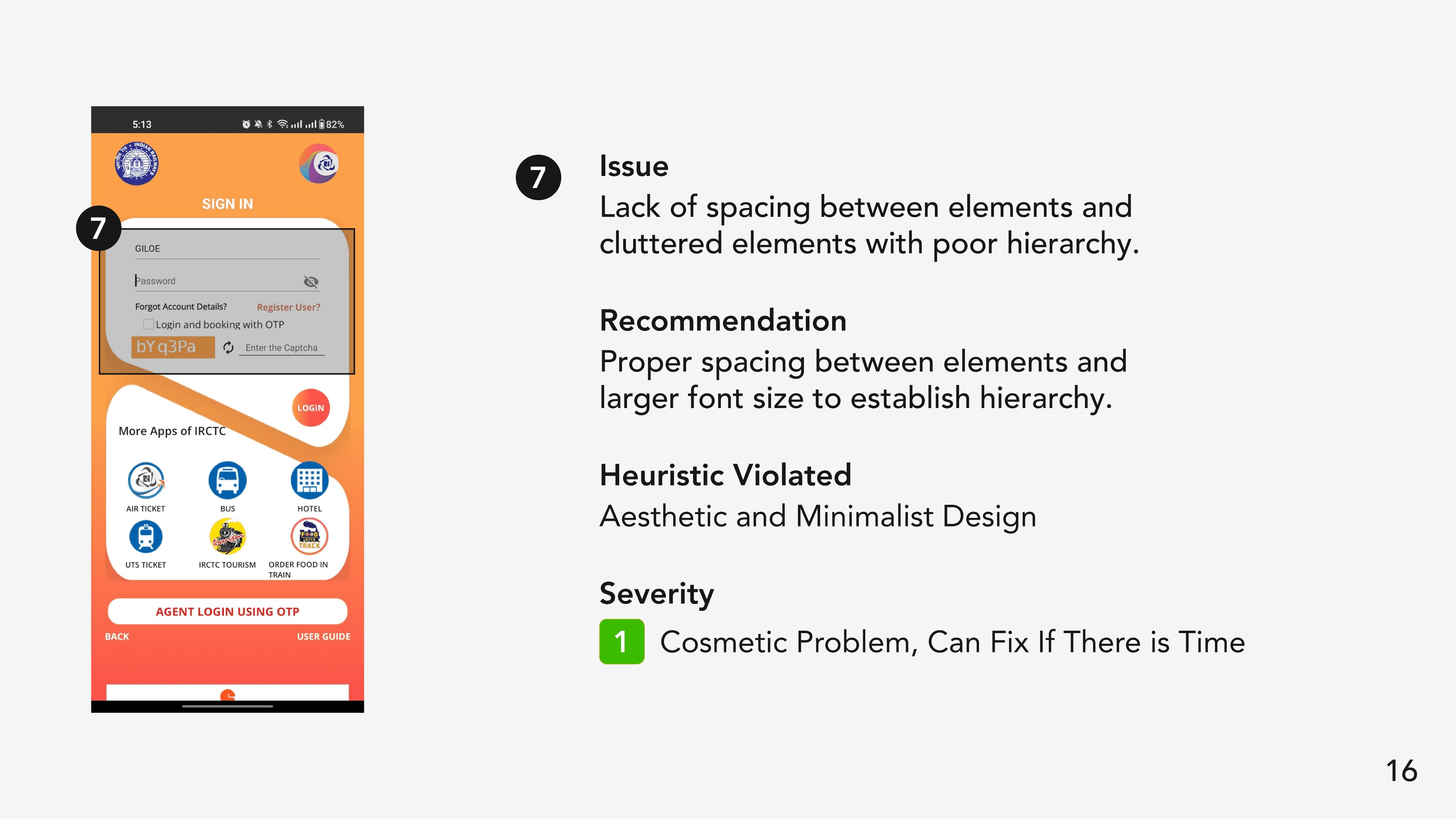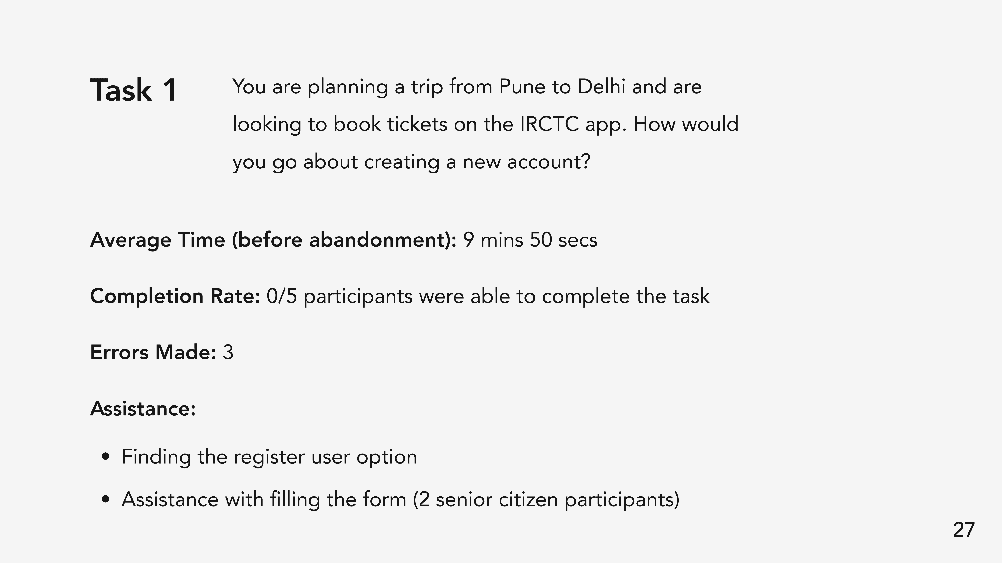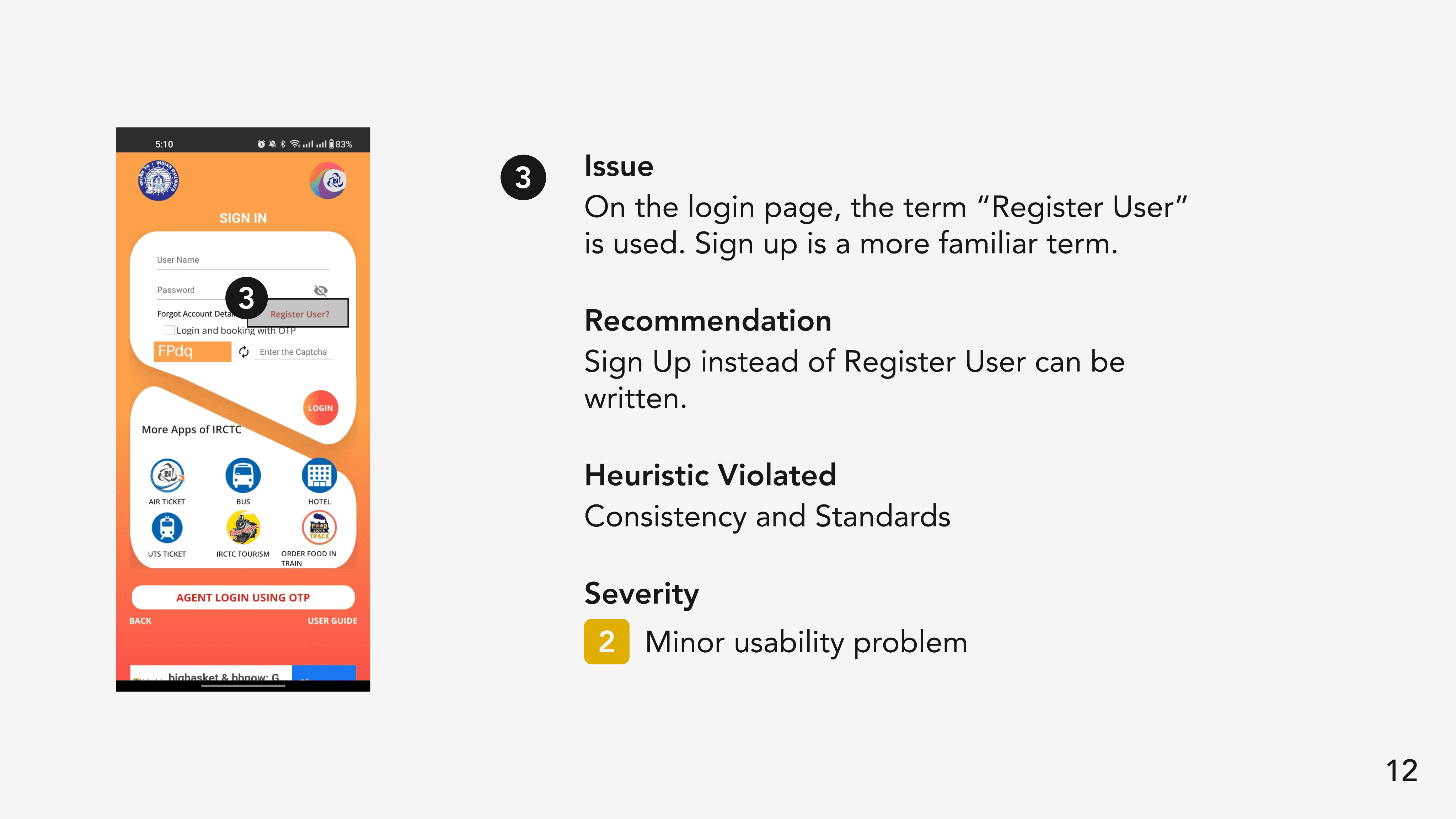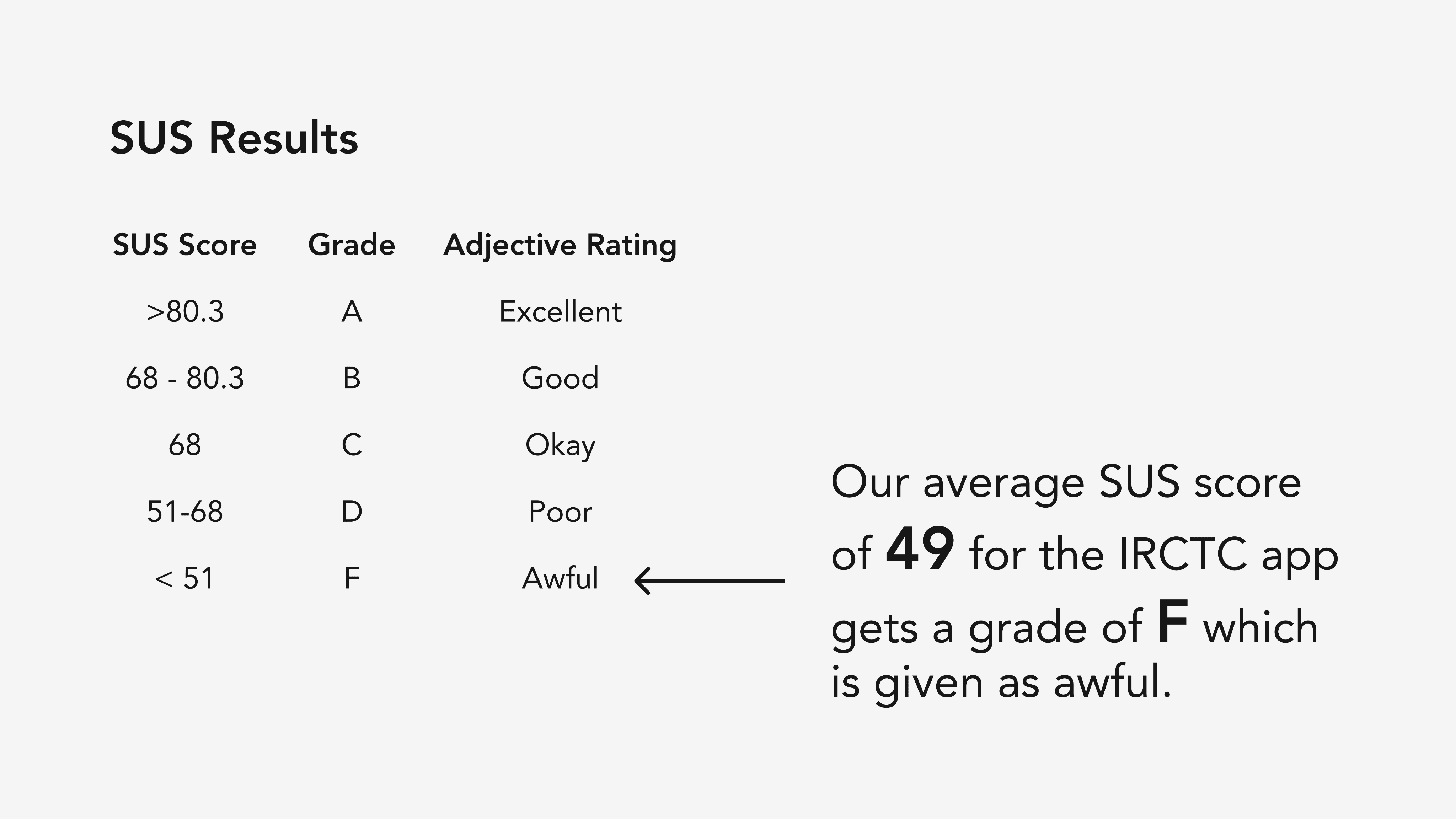 The IRCTC app got a grade 5 which is considered awful. This meant that the app has major usability issues which prevents users from achieving their goals. This was consistent with our observations from the testing sessions.